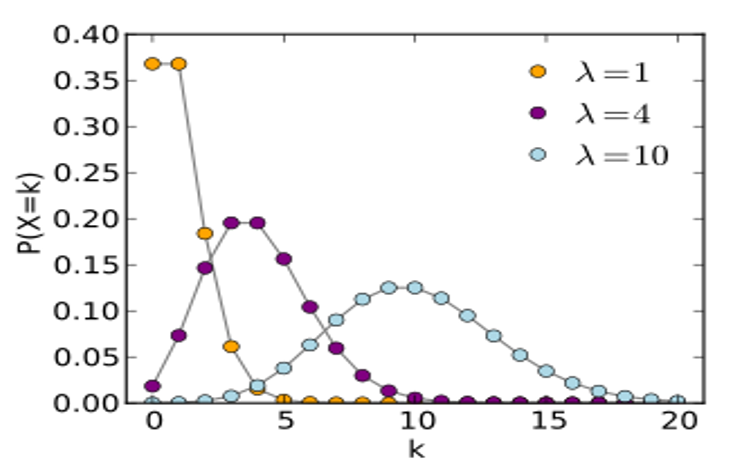 - Poisson distribution: (small probability event) the distribution of the number of users clicking a button within 1 second. (Many applications: number of car accidents at an intersection per unit of time, number of mutations in DNA, number of radioactive nuclei decaying ......)